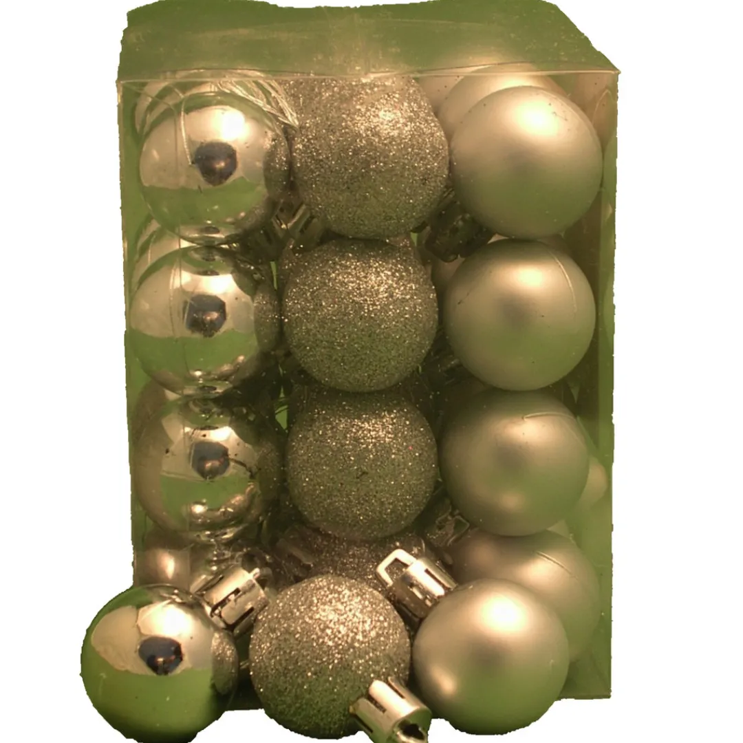 Tub of 36 shatterproof mini silver Baubles. 3cm (1¼inch) diameter with silver hanging cord. 3 assorted styles in each pack.