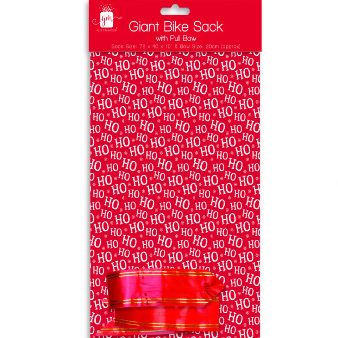 A simple and convenient way to wrap those extra large gifts. This giant Christmas gift bag is made from red polythene printed with white ‘Ho Ho Ho’ and supplied with a pull-bow for the finishing touch. The bag measures approximately 180cm x 100cm (72 x 40 inches) with a 25cm (10 inch) gusset.