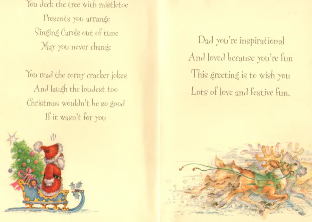 Inner message: You deck the tree with misteltoe Presents you arrange Singing Carols out of tune May you never change. You read the corny cracker jokes And laugh the loudest too Christmas wouldn’t be so good If it wasn’t for you.