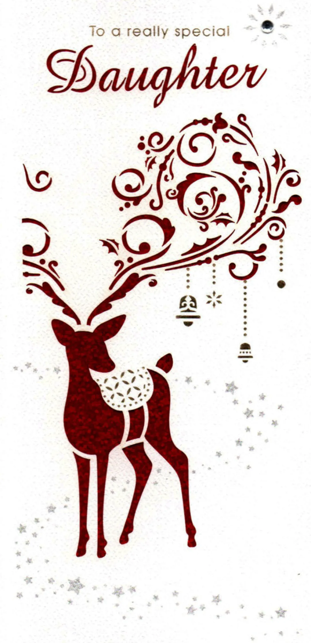 A diecut bi-fold Christmas card for a daughter with red foil insert 22cm x 10cm (8½in. x 4in.). Supplied with envelope.