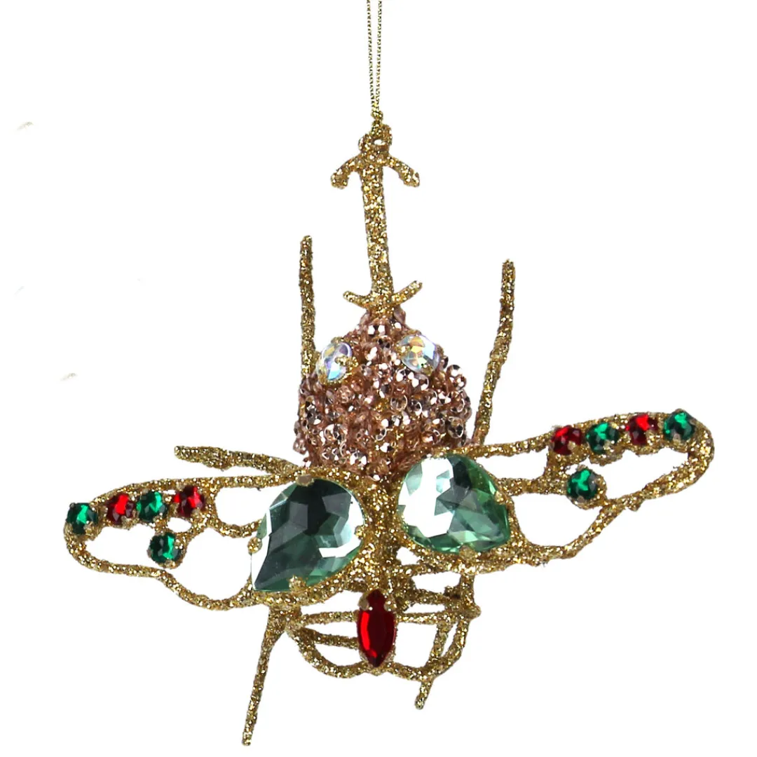 A sparkling beetle formed from wire, covered in gold glitter and brightly decorated with red and green ‘gemstones’. Approximately 12cm (4¾inch) long and 12cm wide on gold cord hanging loop. Gisela Graham design.
