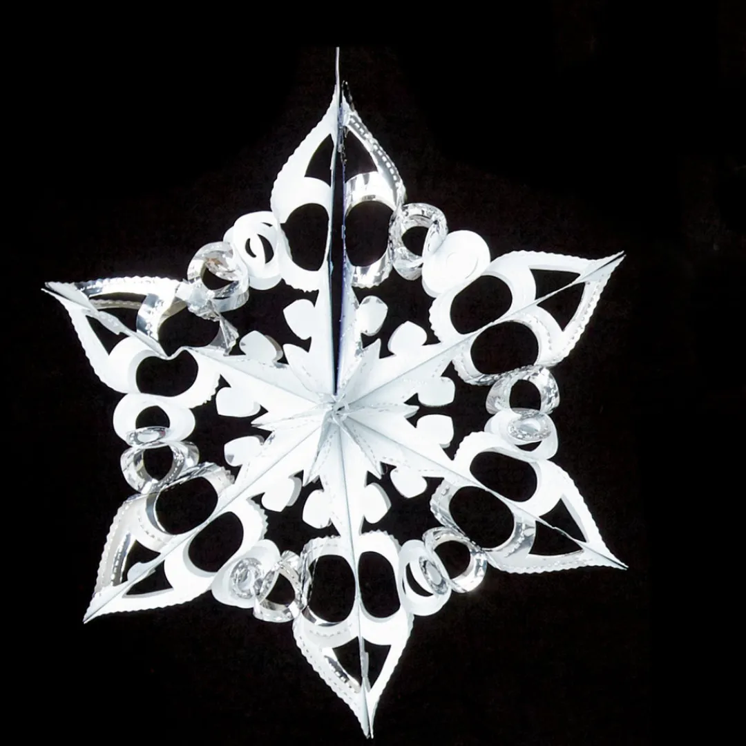 Decorate your Christmas party or wedding reception with this traditional fold-out hanging decoration in silver and white foil. Approximately 40cm (15¾in.) on vinyl hanging cord. Supplied flat with simple pull-out assembly.