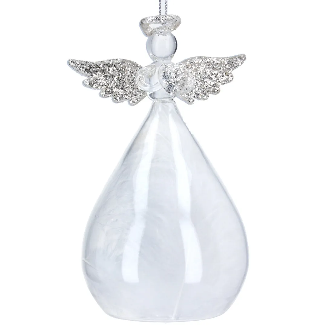 12.5cm (5 inch) clear glass angel with silver glitter wings and halo. Body contains fine white feathers.