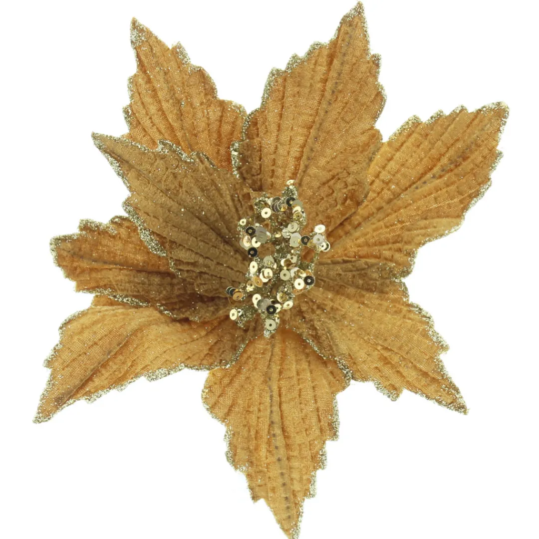 Stunning Gold Poinsettia, a magnificent addition to your festive decorations. Crafted from fabric, this exquisite poinsettia features a captivating deep golden hue with dazzling glitter edges. When fully opened, it spans a generous 26cm (10 inches) in width, boasting an impressive presence that is sure to catch the eye. Designed with convenience in mind, this splendid flower is equipped with a 6cm stem and a practical metal clip, allowing for effortless attachment to various elements of your Christmas ensemble. Whether adorning your Christmas tree, wreath garland, or festive display, the Gold Poinsettia effortlessly adds a touch of elegance and enchantment to any setting. The delicately textured leaves of the poinsettia are adorned with a subtle gold glitter, adding a touch of sparkle and sophistication. Nestled within these glistening leaves is a berry core, shimmering with glitter and adorned with exquisite gold sequins. The combination of opulent details creates a truly mesmerizing focal point that embodies the spirit of the holiday season.
