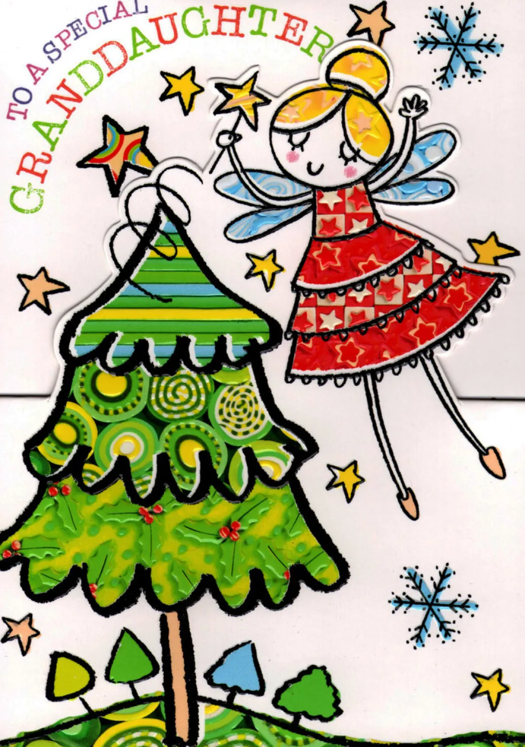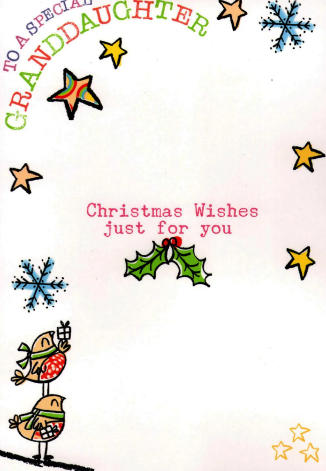 A fold-out Christmas card for a Granddaughter. Three folds with diecut front piece. 17cm x 12cm (6½in.x 4½in.). Supplied with envelope.