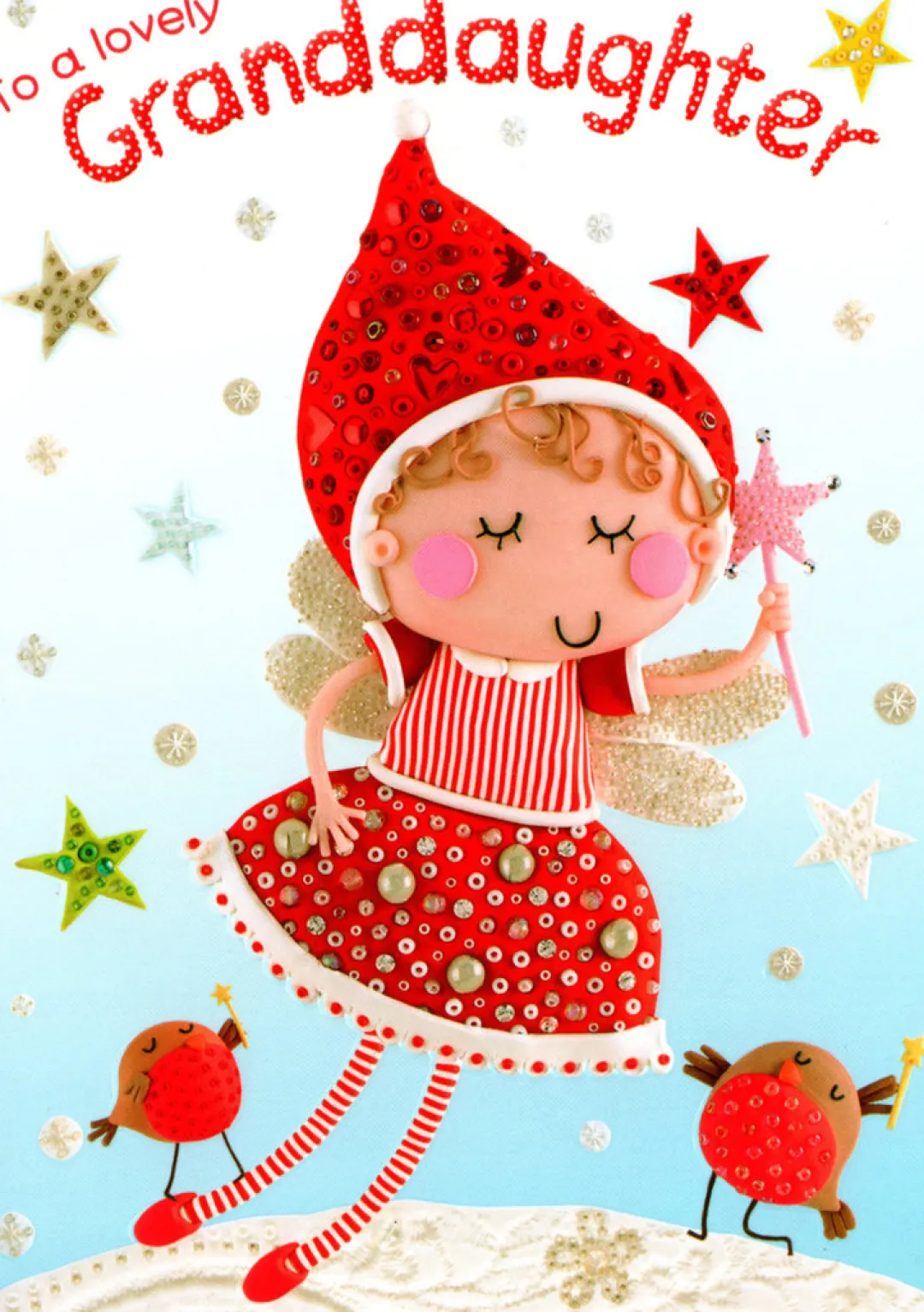 A Christmas card for a Granddaughter with embossed glossy image. 17cm x 12cm (6¾in.x 4¾in.). Supplied with envelope.