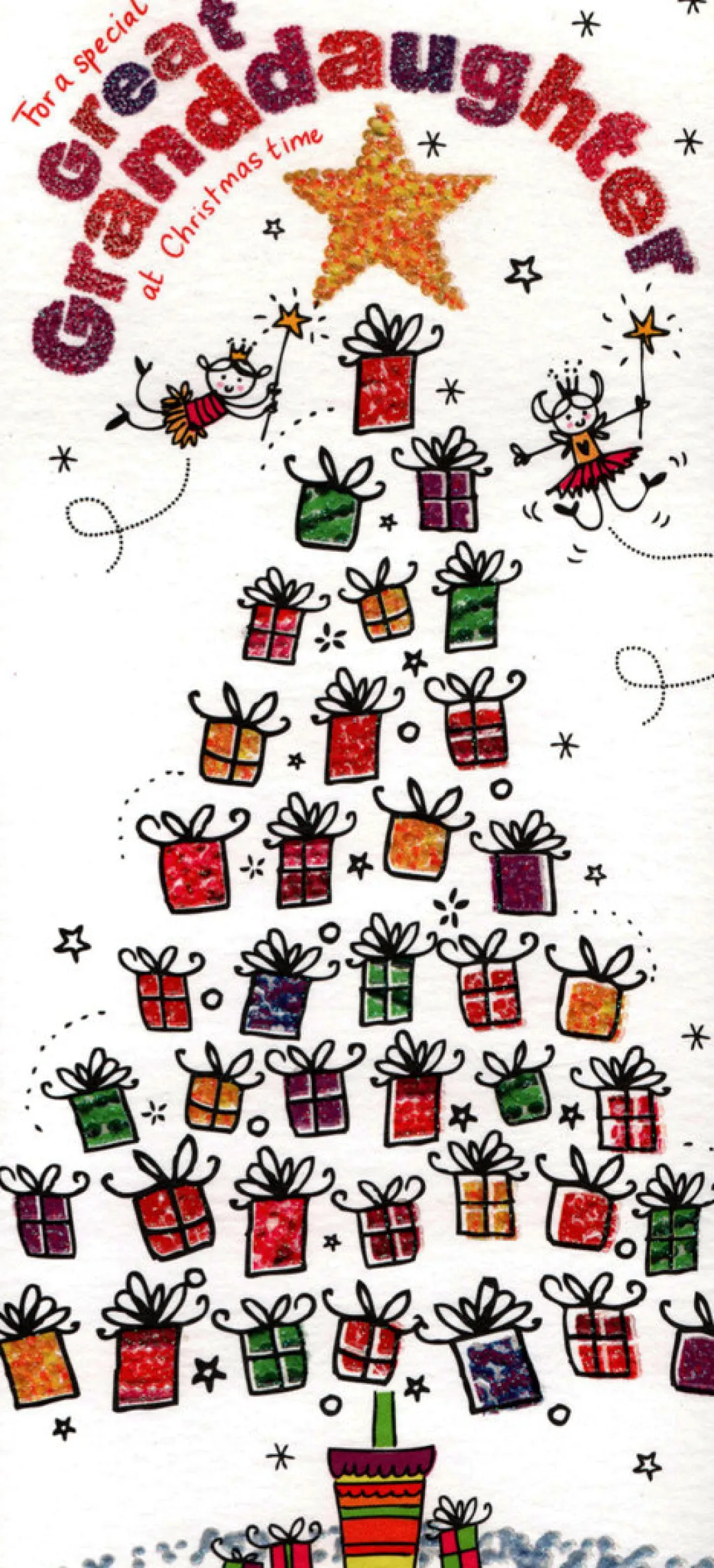 Christmas card for a greatgranddaughter. 22cm x 10cm (8¾in. x 4in.). Supplied with envelope.