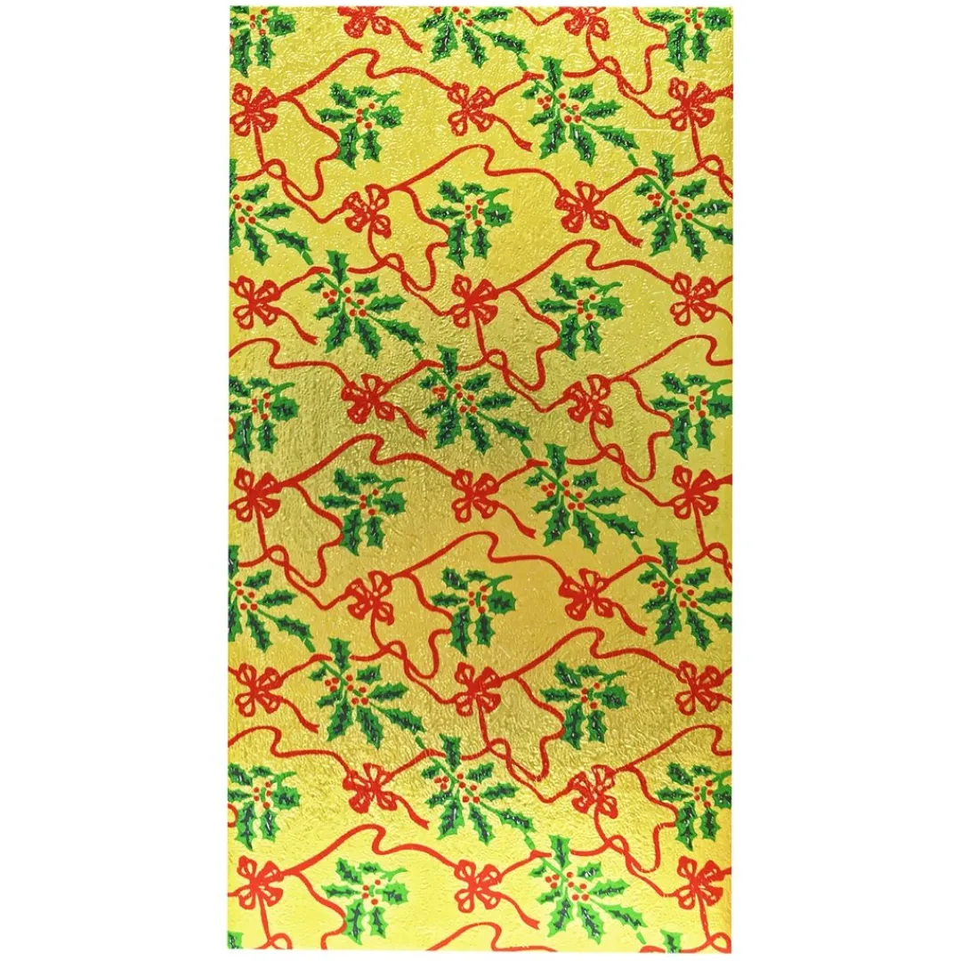 25cm x 12.5cm (approximately 10″ x 5″) foil covered Christmas Yule log board. Holly design on gold background.