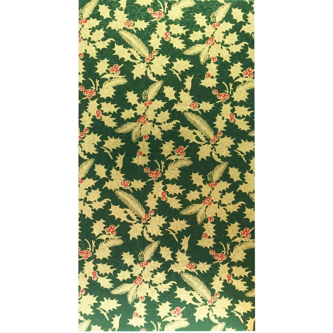 25cm x 12.5cm (approximately 10″ x 5″) foil covered Christmas Yule log board. Holly design on green background.