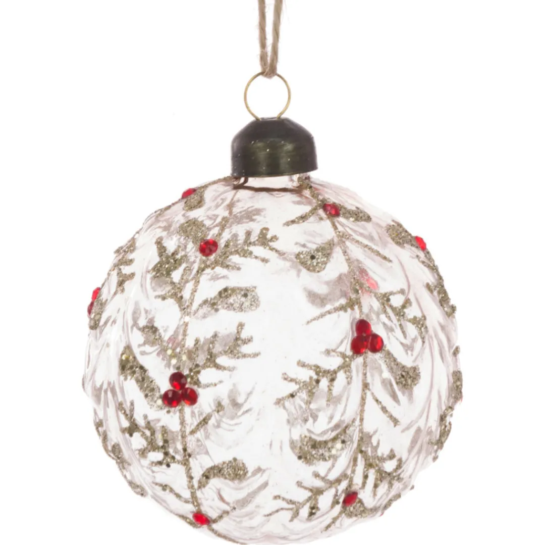 8cm (3¼”) diameter embossed clear glass bauble with gold highlights and red gemstone berries.