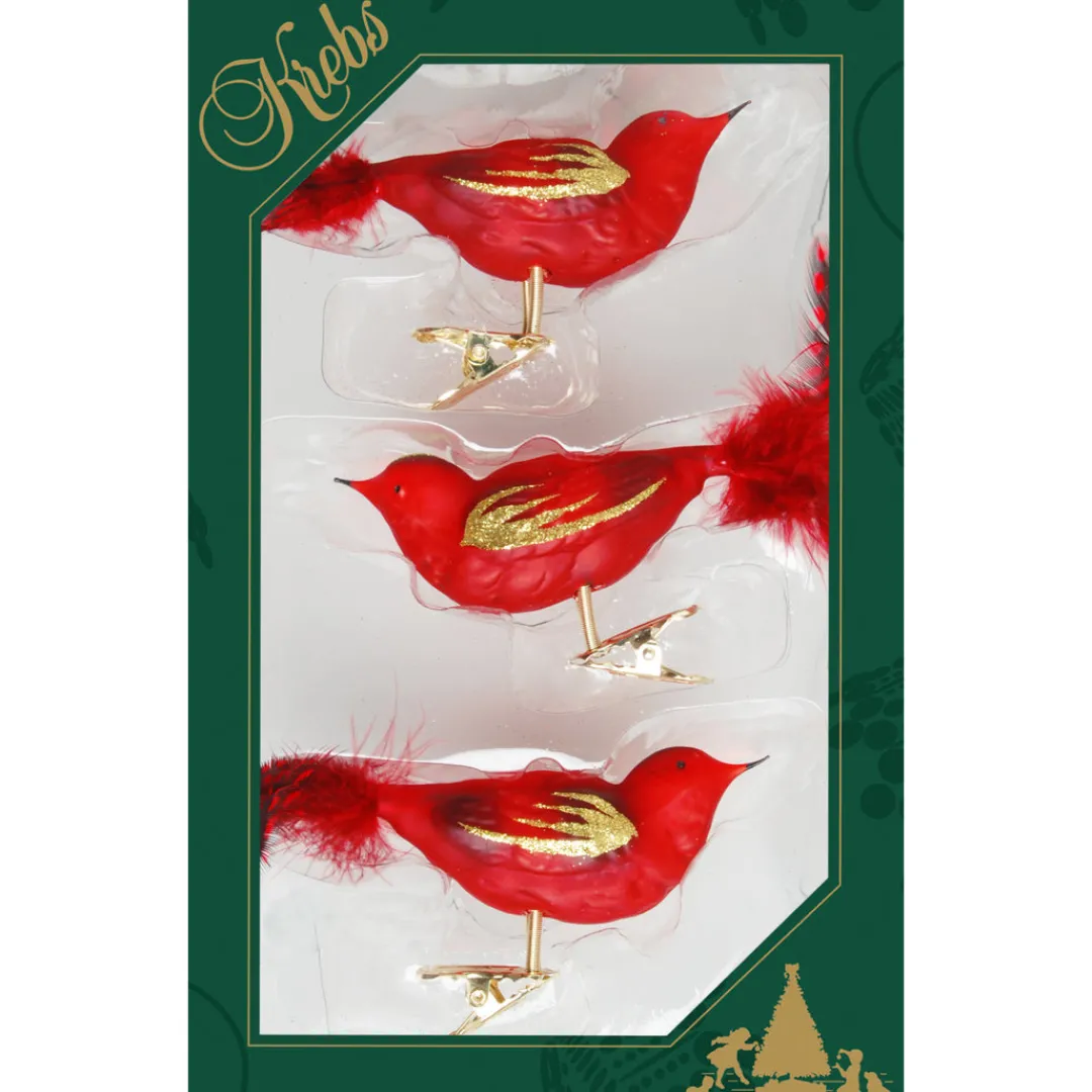 Clip-on red glass birds with gold glitter trimmings. Total length including tail approximately 14cm (5½ inch).