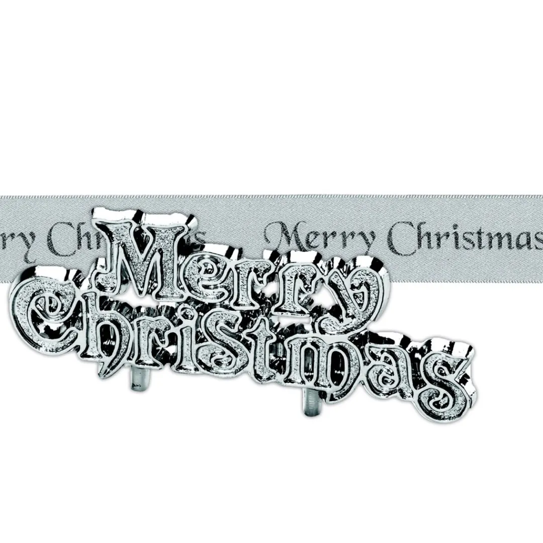 Decorate your Christmas cake with this 2 piece set containing a 1 metre (39″) long by 2.5cm (1″) wide silver ‘Merry Christmas’ ribbon (100% polyester) and a 7.2cm wide silver Merry Christmas acrylic sign.