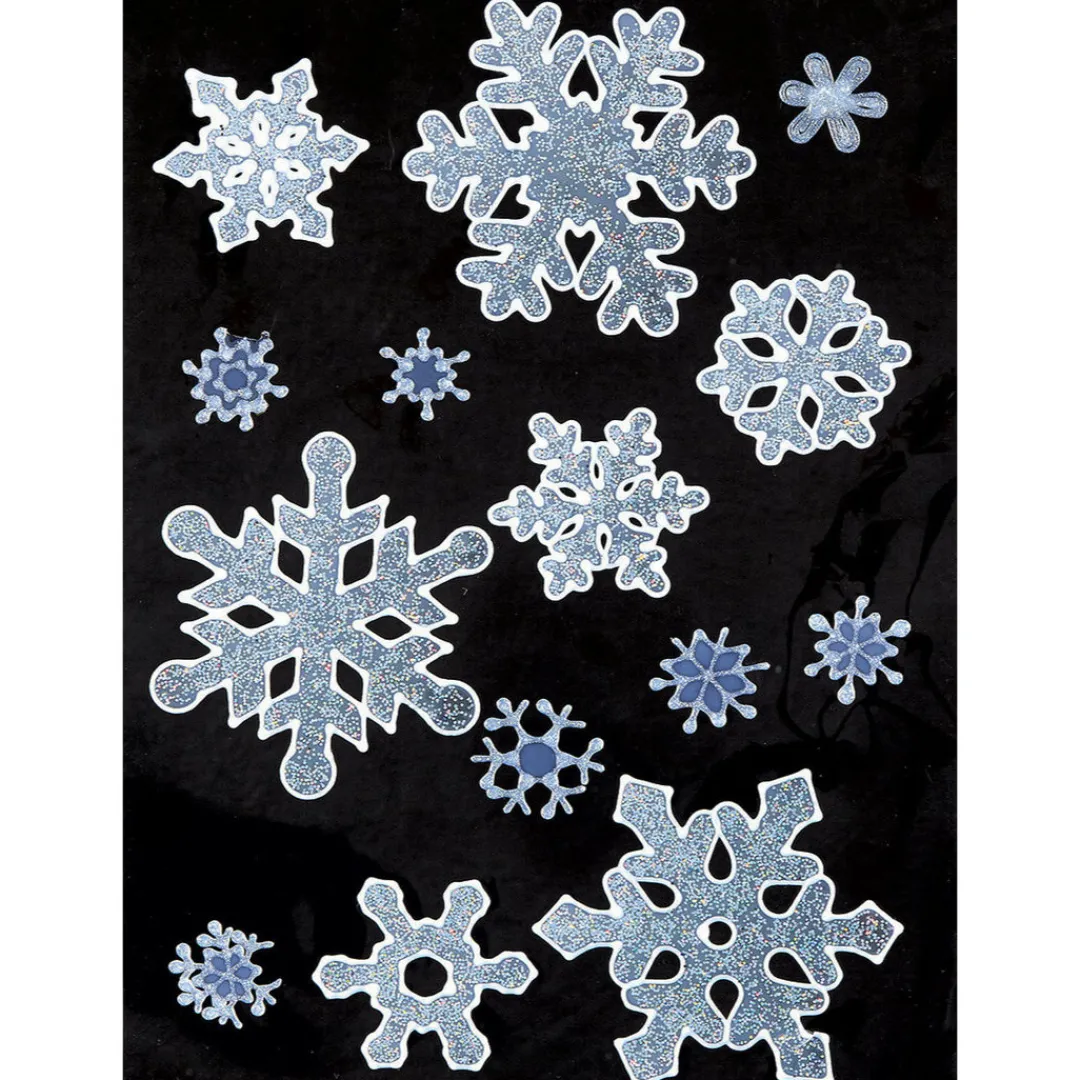 Set of assorted embossed window stickers with iridescent highlights. Individual snowflakes from 3.5 to 12.5cm (1¼ to 5 inches).