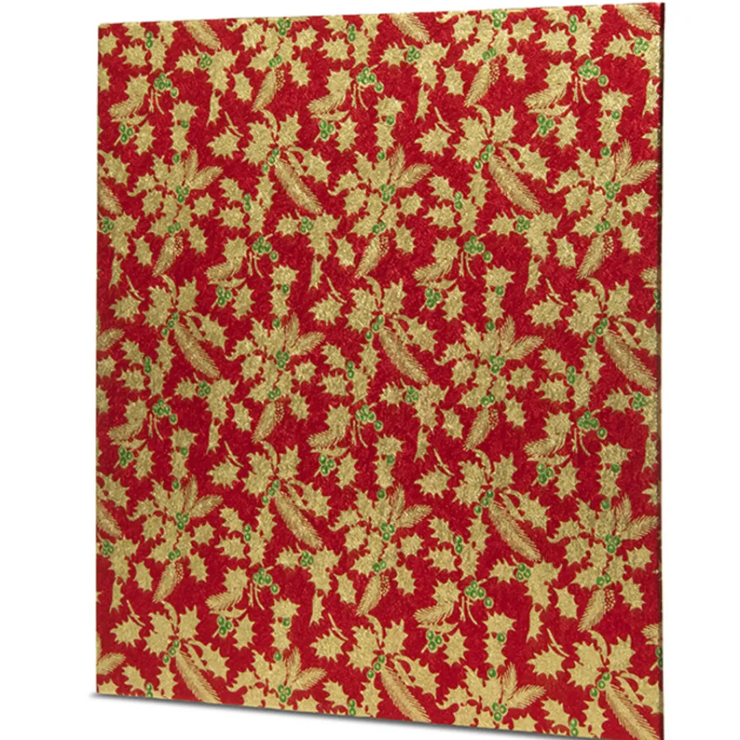 25cm (10″approx.) square foil covered Christmas cake board. Holly design on a red background.