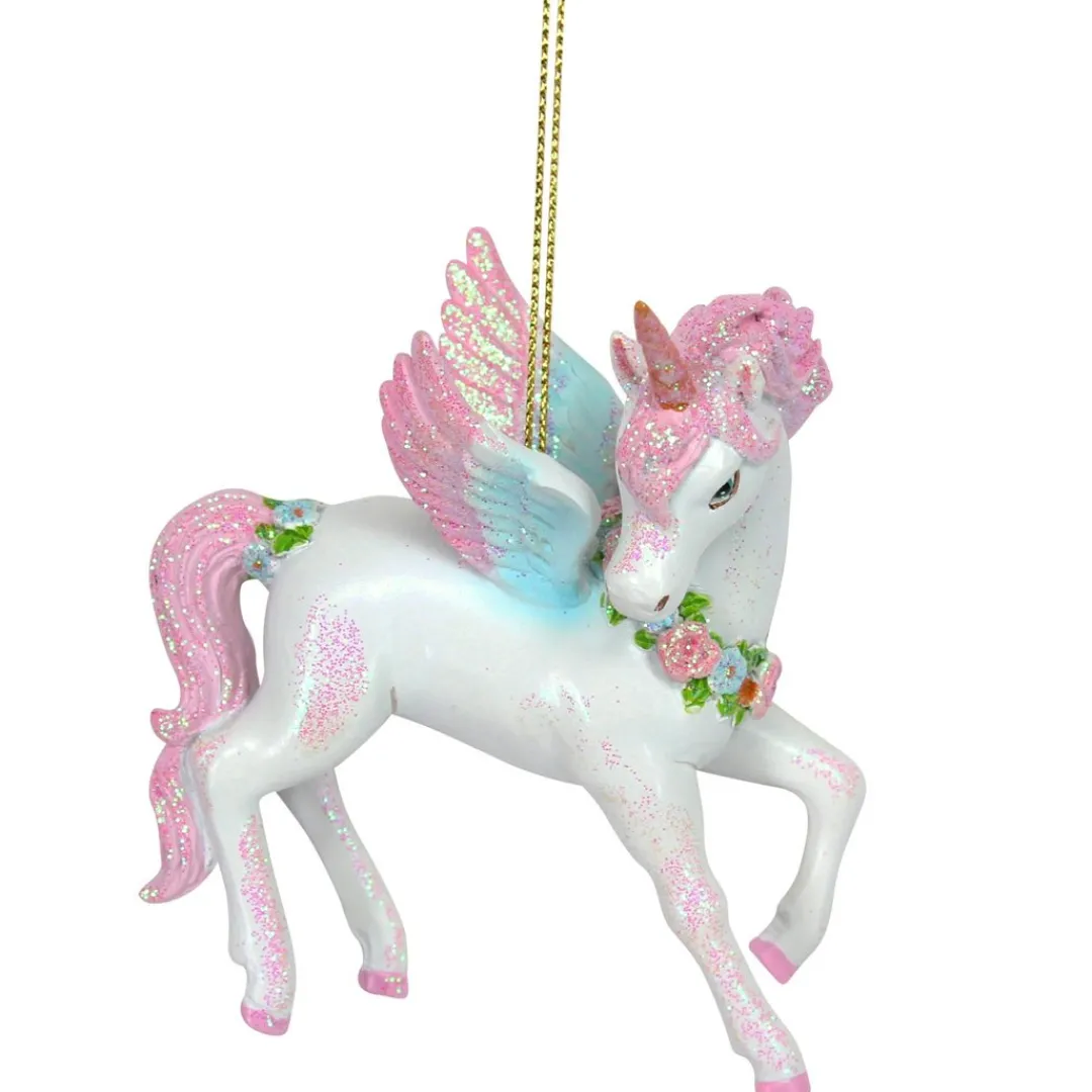 A beautiful addition to a fantasy themed Christmas tree. Handpainted resin unicorn on cord hanging loop. Approximately 8.5cm tall. Gisela Graham design.