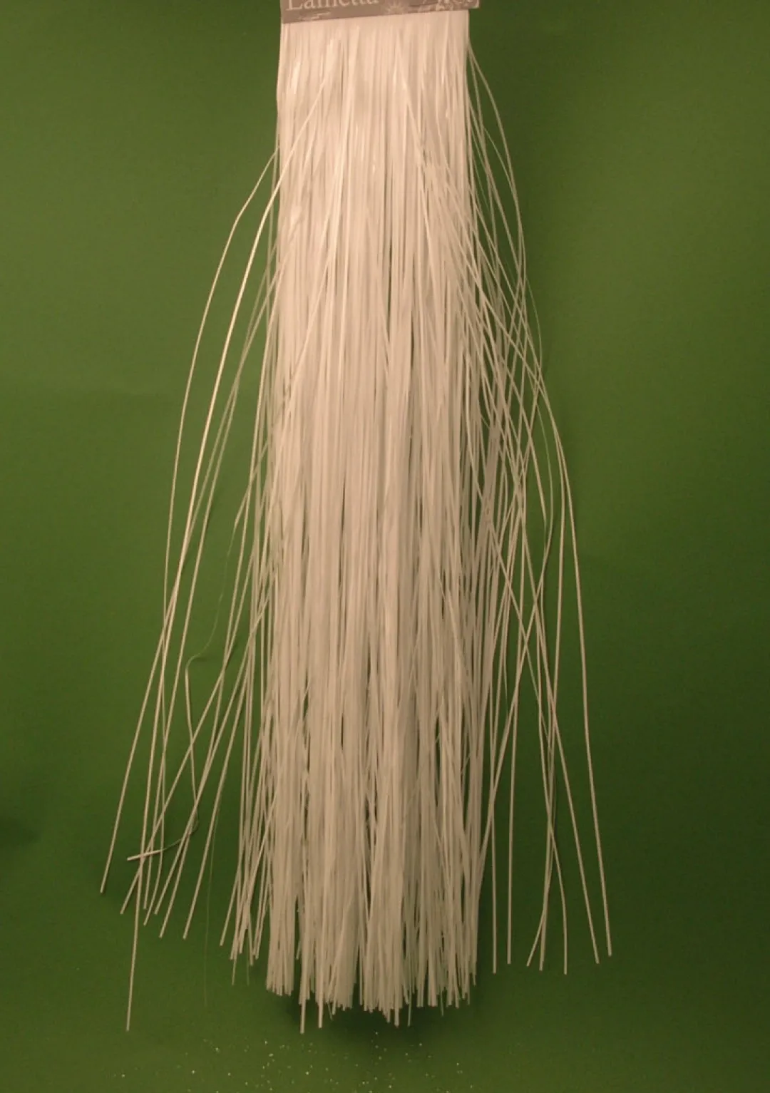 A fine cut white lametta on 30cm wide header strip. Simply pull strands from header and scatter onto your Christmas tree or arrangement. 48cm long metallic foil.