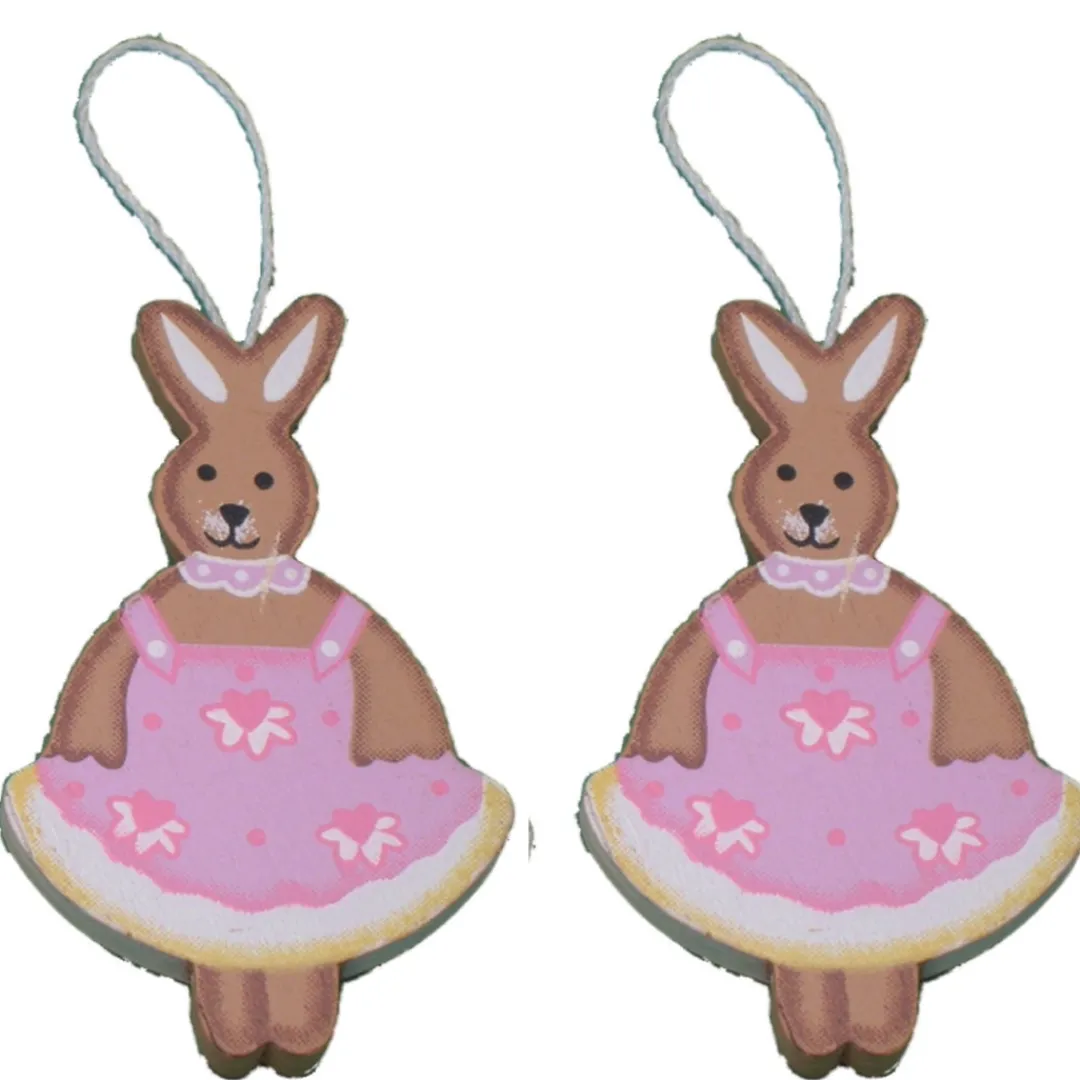 Enhance your Easter or Christmas decor with this delightful Set of 2 Wooden Bunnies. Crafted from high-quality pink wood, these diecut bunnies are perfect for adding a charming touch to any festive display. Each bunny is double-sided and hangs gracefully from a cord loop, making it easy to showcase their whimsical design. Measuring approximately 6.6cm (2½ inches) tall, these wooden bunnies are the ideal size to hang on your Christmas tree or incorporate into your Easter celebrations. Their delicate pink hue adds a soft and cheerful touch to any setting, creating a warm and inviting atmosphere. Whether you are looking to embellish your Easter display or add a unique element to your Christmas decorations, these wooden bunnies are a must-have. Crafted with attention to detail, they bring a touch of nature and charm to your home or event.