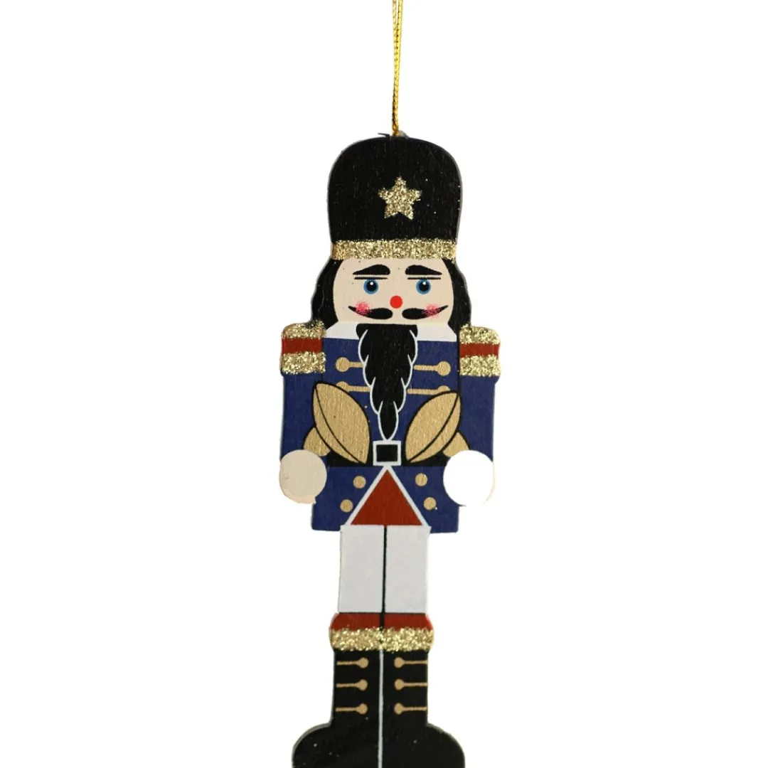 A cut-out wood soldier in blue jacket and dark blue trousers reminiscent of the traditional nutcracker figure. Double-sided with gold glitter highlights. Approximately 12.5cm tall on a cord hanging loop. Ideal for small and big children to hang on their tree.
