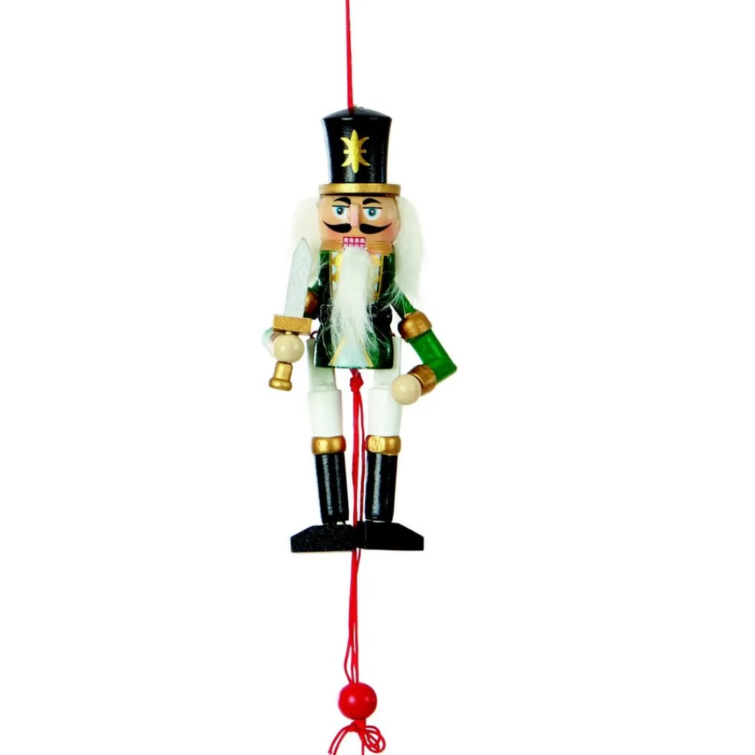 12 centimetre (4.75 inch) tall wooden soldier with sword. Pull the red cord to see his arms and legs jump.
