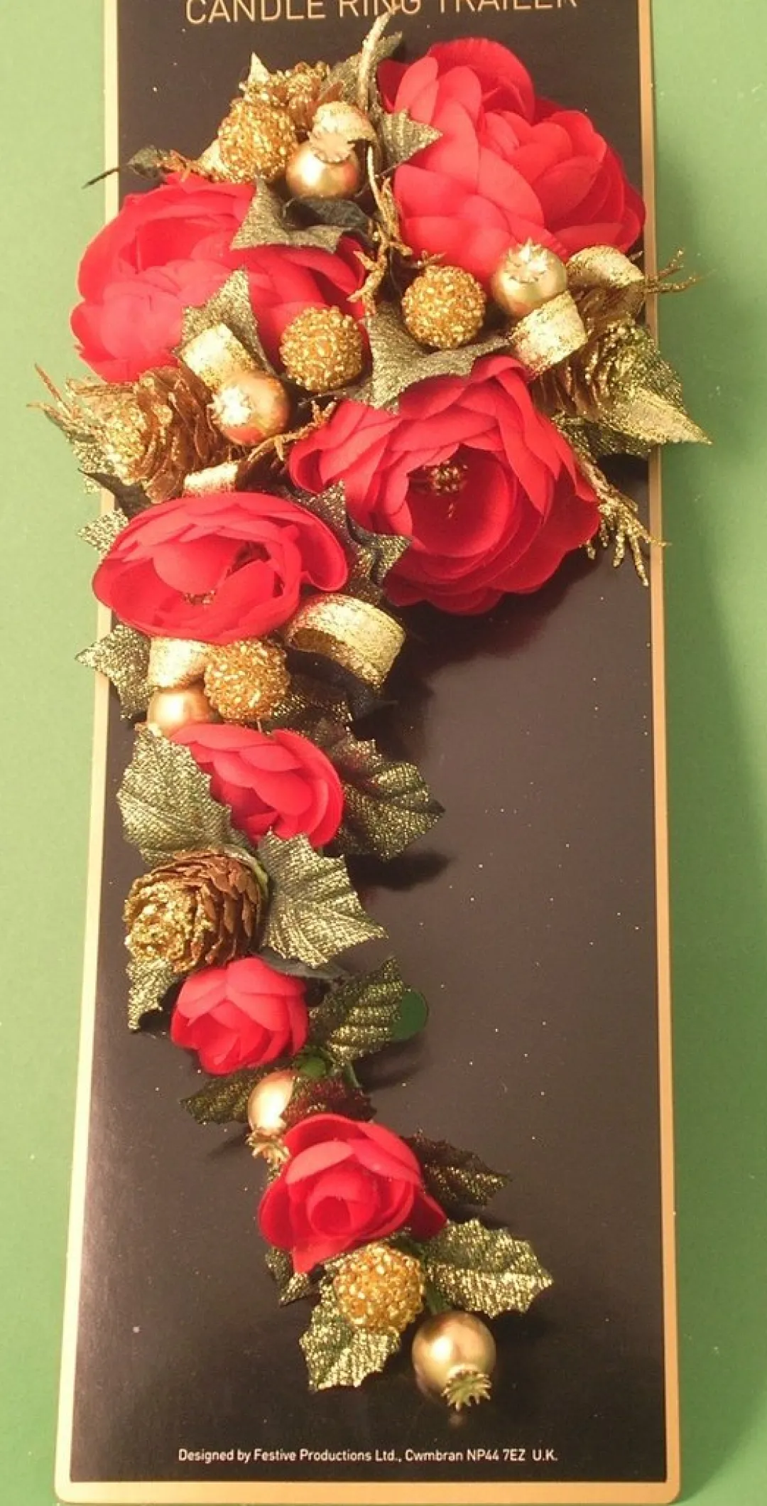 Add the finishing touch to your candles this Christmas with this trailing candlering. Suitable for 25mm diameter candle. Artificial rosebuds on authentic holly leaves dressed with gold glitter. Total length approx. 28cm (11 inches). Can also provide an attractive hanging decoration on your Christmas tree. Candle and holder not included. Shown for illustration purposes only.