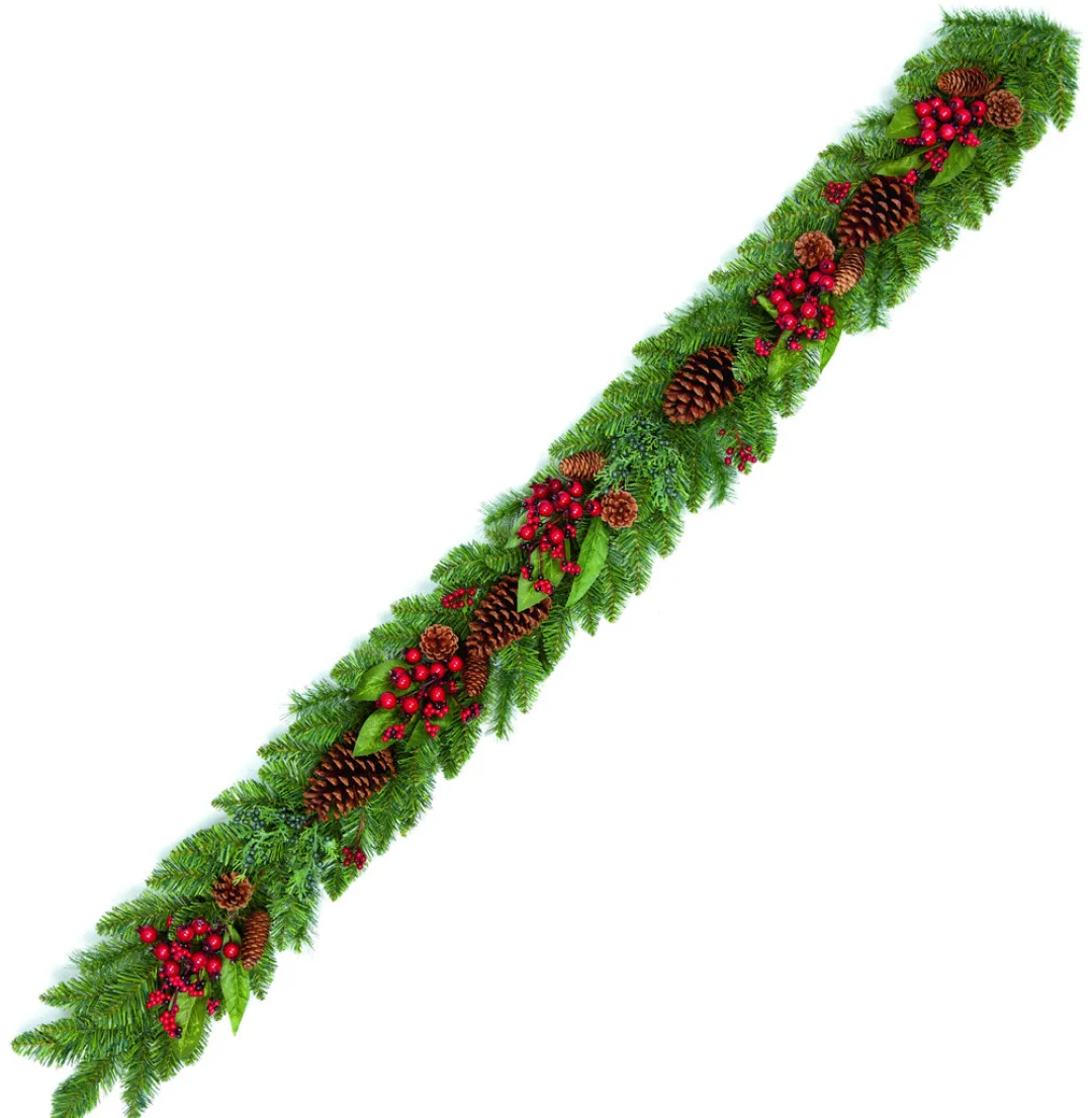 A stylish artificial pine garland dressed with fabric leaves, pine cones, red berries and foliage. Approximately 180cm (6ft.) long.