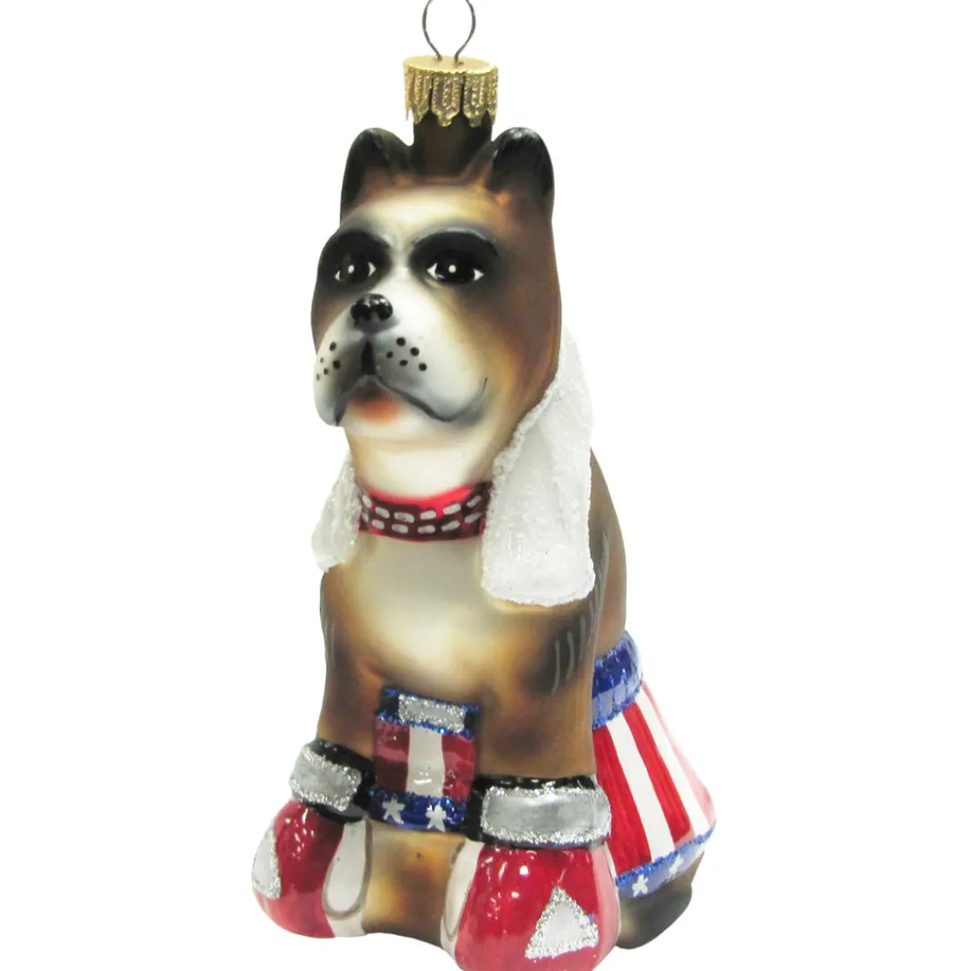 Add a touch of elegance and charm to your home décor with the exquisite Glass Boxer Dog figurine. Standing at approx. 10.2cm (4 inches) tall, this hand decorated blown glass masterpiece is carefully crafted by the renowned Krebs Glas Lauscha GmbH of Germany. Whether you are a collector or simply appreciate fine art, this stunning boxer dog hanging trim is a must have addition to your collection. Perfect for gifting to a loved one who is a fan of the Rocky films or simply adores dogs, this exquisite piece is sure to be cherished for years to come. Bring a touch of sophistication to any room with the unique and beautiful Glass Boxer Dog trim.