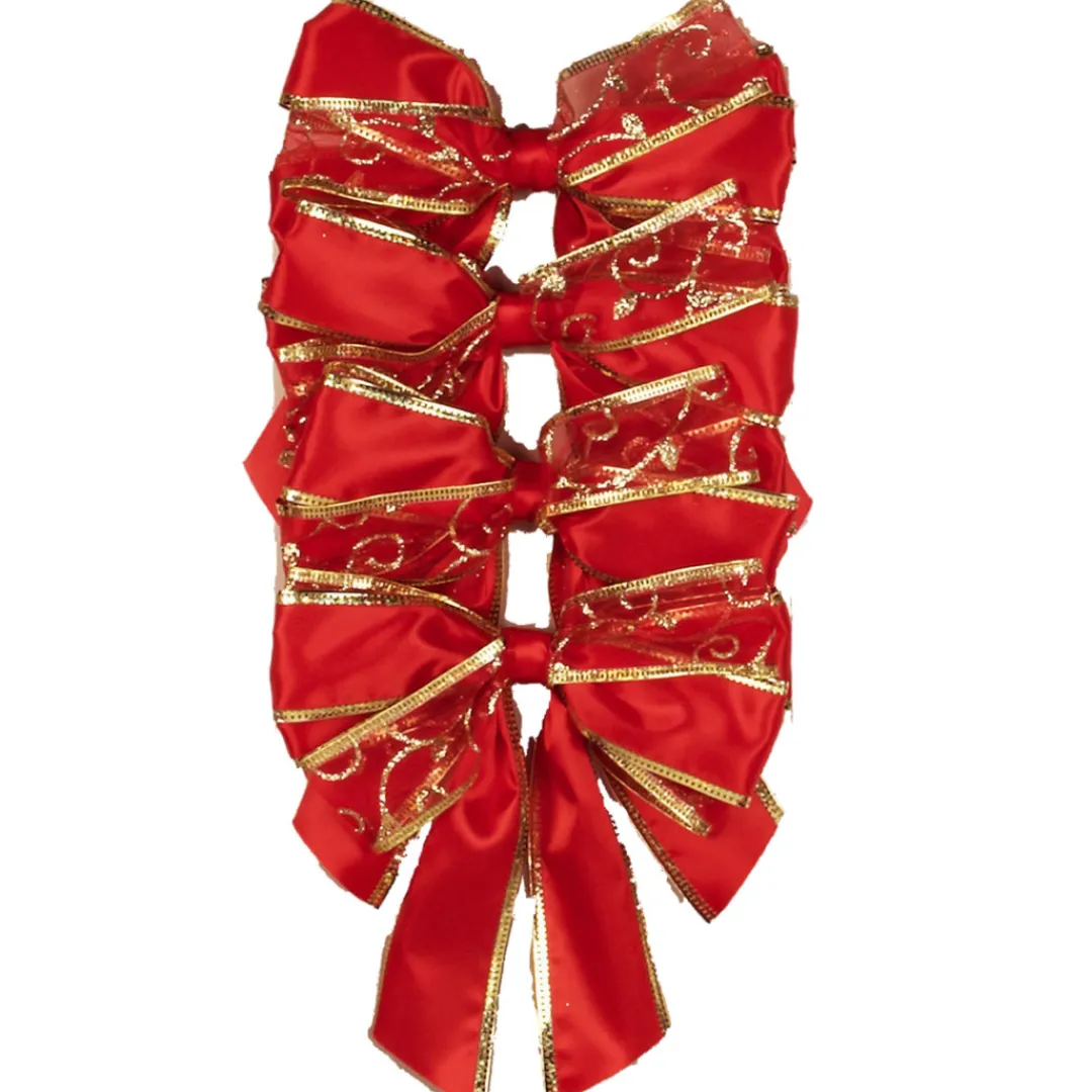 Add a touch of elegance and festive flair to your Christmas decor with this pack of 4 Red & Gold Bows. Each bow is approximately 15cm wide x 15cm tall, and comes with ties on the back for easy fixing to your tree or garland. These decorative bows are made from two types of ribbon – red satin and printed sheer, both edged with wired gold trimming. The combination of rich red and luxurious gold adds a sophisticated and eye-catching touch to your Christmas decorations. Perfect for adding a pop of colour and sparkle to any space, these bows are a versatile and stylish addition to your Christmas collection. With their classic design and high-quality construction, these bows are sure to impress your guests and enhance the festive atmosphere in your home.